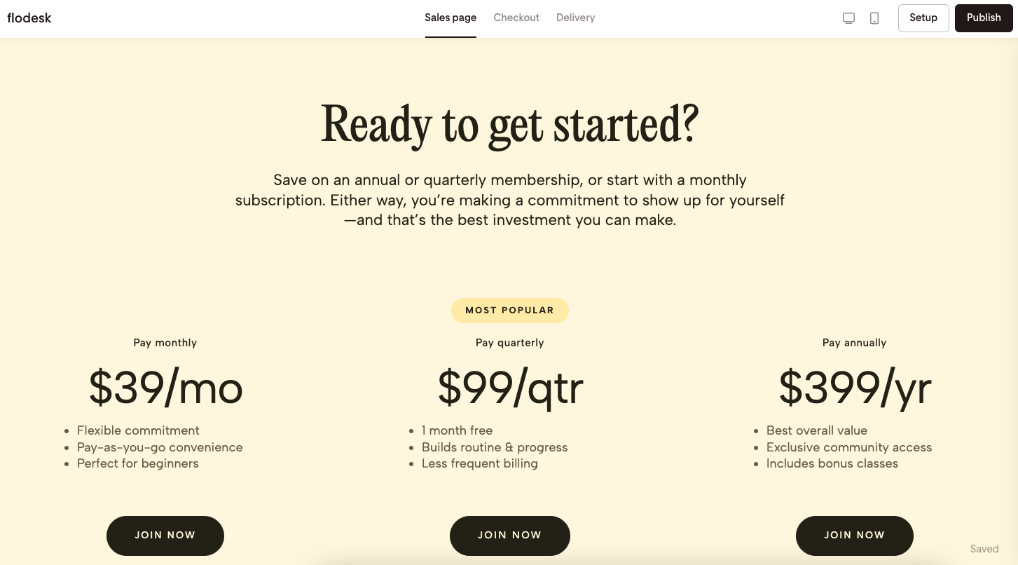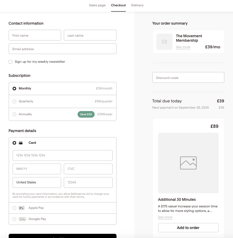 Minimal, sleek sales page & checkouts work really nicely for a creative audience (not too ‘salesy’ looking)