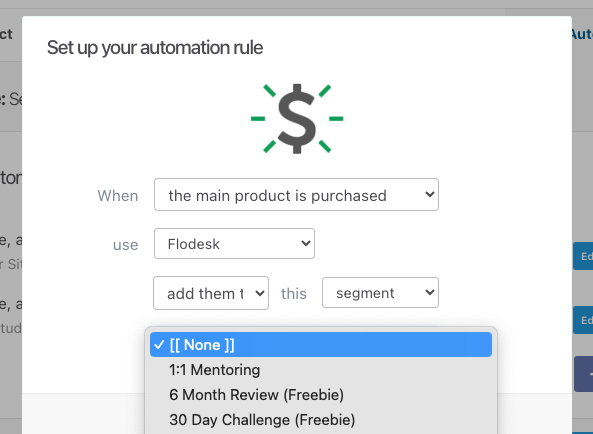 Then, whenever you set up a product in Thrivecart, if you go to the ‘Automation’ tab, you can set up an automation rule to add customers to specific Flodesk email subscriber segments.